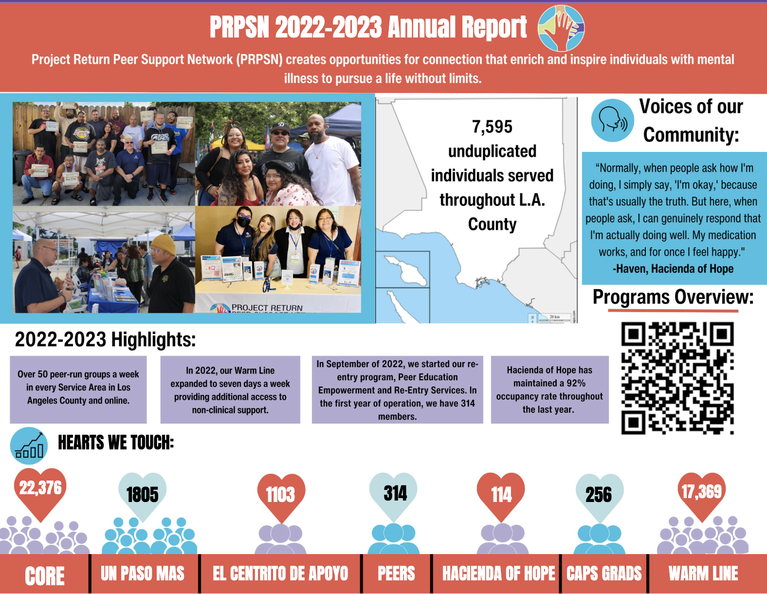 Our annual reports highlight the impact of peer support. Each year, we share stories and key outcomes that reflect the collective efforts of our staff, volunteer facilitators, partners, and community. These reports offer transparency into our work while celebrating the progress we continue to make in expanding recovery oriented mental health services.